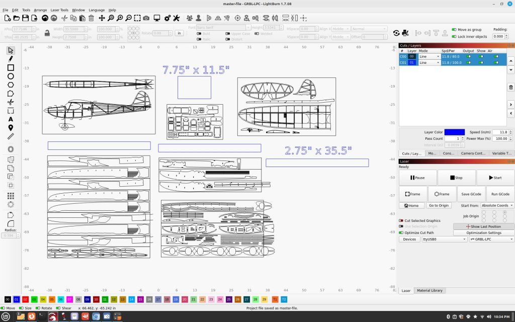 When there are vector based plans available via. PDF or otherwise, I’m able to import them for use directly. There still is some noodling to configure things for the standard US based stock I work with, shown in the blue outlines, but in this case, the designer at least set up their own cut sheets which makes the job easier to quote. In this case, it’s going to be around 22 sheets of stock, the wingspan is 55″ to give you an idea of scale and the quote was for $220.00.