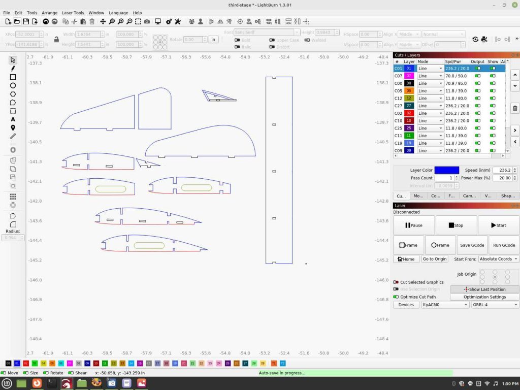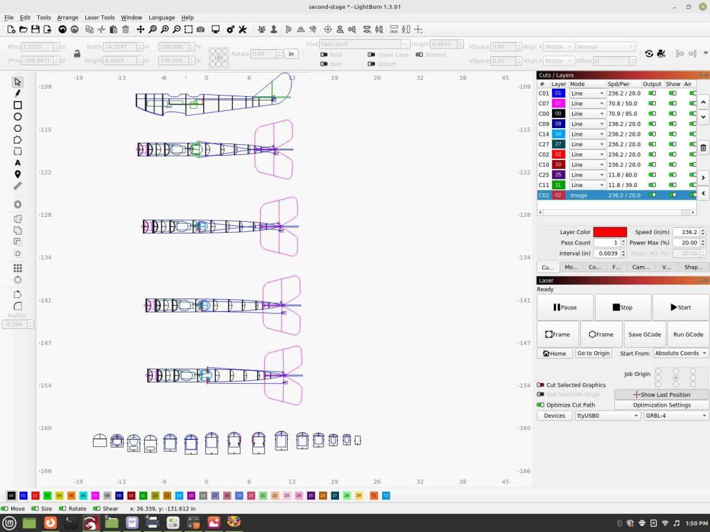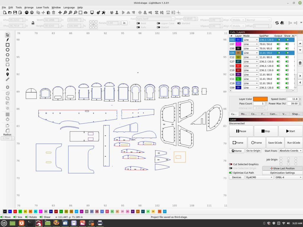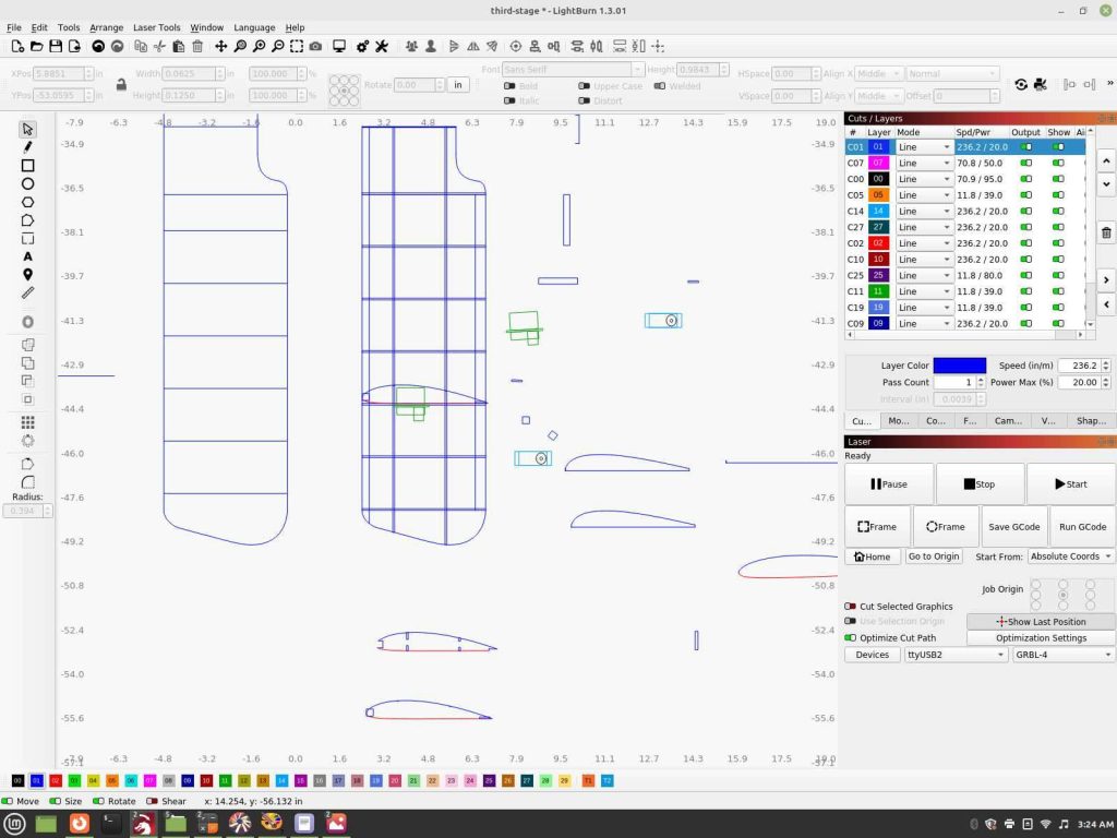 More with the third stage for instruction. I do suggest to leave the cockpit sheets merely engraved for new builders and cutting out afterwards. There is also a ring around the nose of the grill/nose cover that is not shown. The assembly on the grill and nose cover is only taped on or using covering to keep in place to allow for access to the motor after the fact.